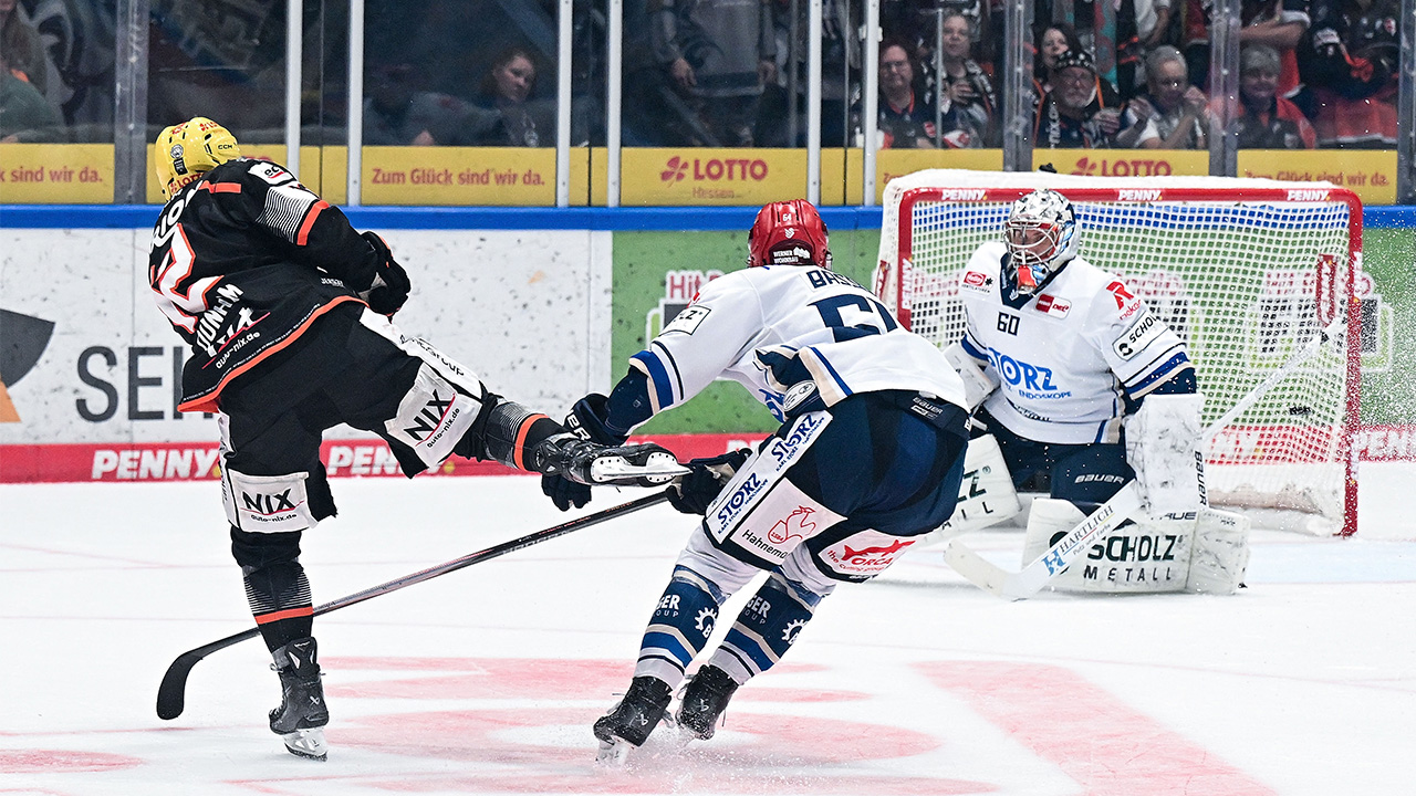 Aus der Kabine heraus ging es direkt weiter – beide Teams mit dem klaren Ziel, den Sieg zu erringen. Die Löwen waren zunächst im Vorteil, weitere Schüsse fanden jedoch trotz großer Bemühungen nicht den Weg ins Netz. Stattdessen kassierte Carter Proft (#15) eine Zwei-Minuten-Strafe. Kurz darauf standen beide Teams wieder zu fünft auf dem Eis, nachdem auch Tyson Spink wegen unsportlichen Verhaltens auf die Strafbank musste. Auffällig präsentierten sich an diesem Abend gleich zwei Zwillingspaare: Während bei Schwenningen fast immer die Spink-Brüder an gefährlichen Aktionen beteiligt waren, nutzten auf Frankfurter Seite die Kose-Zwillinge ihre üppige Eiszeit.