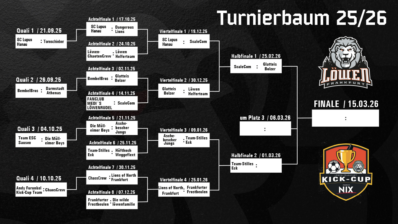 In der ersten Drittelpause kommt es zum Duell "Lions of North Frankfurt" gegen die "Frankfurter Frostbeulen". Der Sieger aus dieser Partie bestreitet dann am 1.3. beim Heimspiel gegen Wolfsburg dasHalbfinale. Der Gegner wird das Team "Stilles Eck" sein.